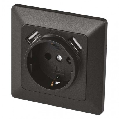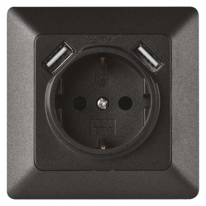 termék: egyszeres dugalj védőtüskével oldalsó és USB kimenettel, 2,1 A max., dizájn: SCHUKO, típus: 250 V~/16 A max., szín: anthracite, összeszerelés módja: dobozba (további mélység min. 40 mm), védettség: IP20, típus: szimpla, értékesítési csomagolás: 1 db, PE csomag, garancia-időszak: 2 év
