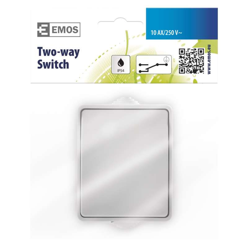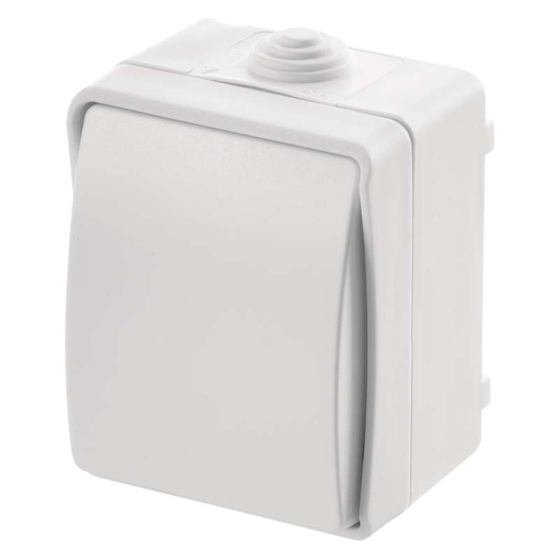 termék: 6. sz. váltakozó kapcsoló, típus: 250 V~/10 AX, szín: fehér, összeszerelés módja: falra, védettség: IP54, típus: 1 gomb, lépcsőházi, vízálló, értékesítési csomagolás: 1 db, PE csomag, garancia-időszak: 2 év