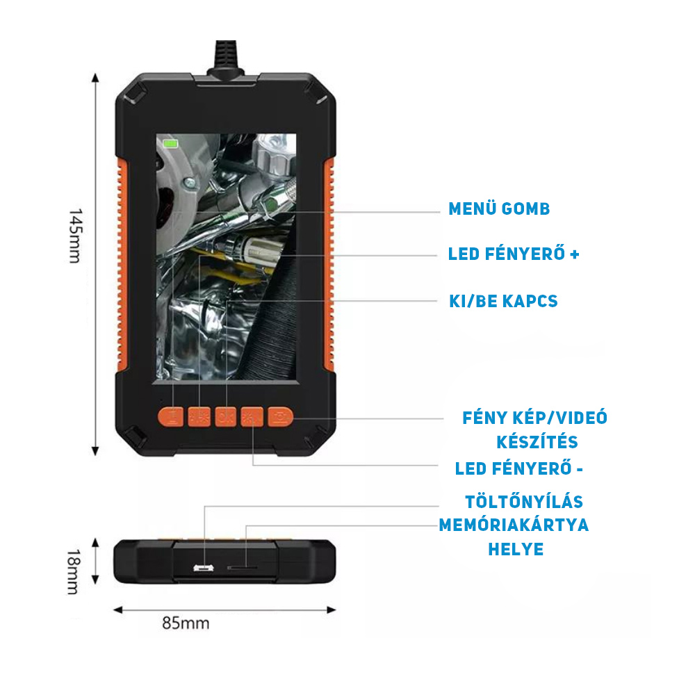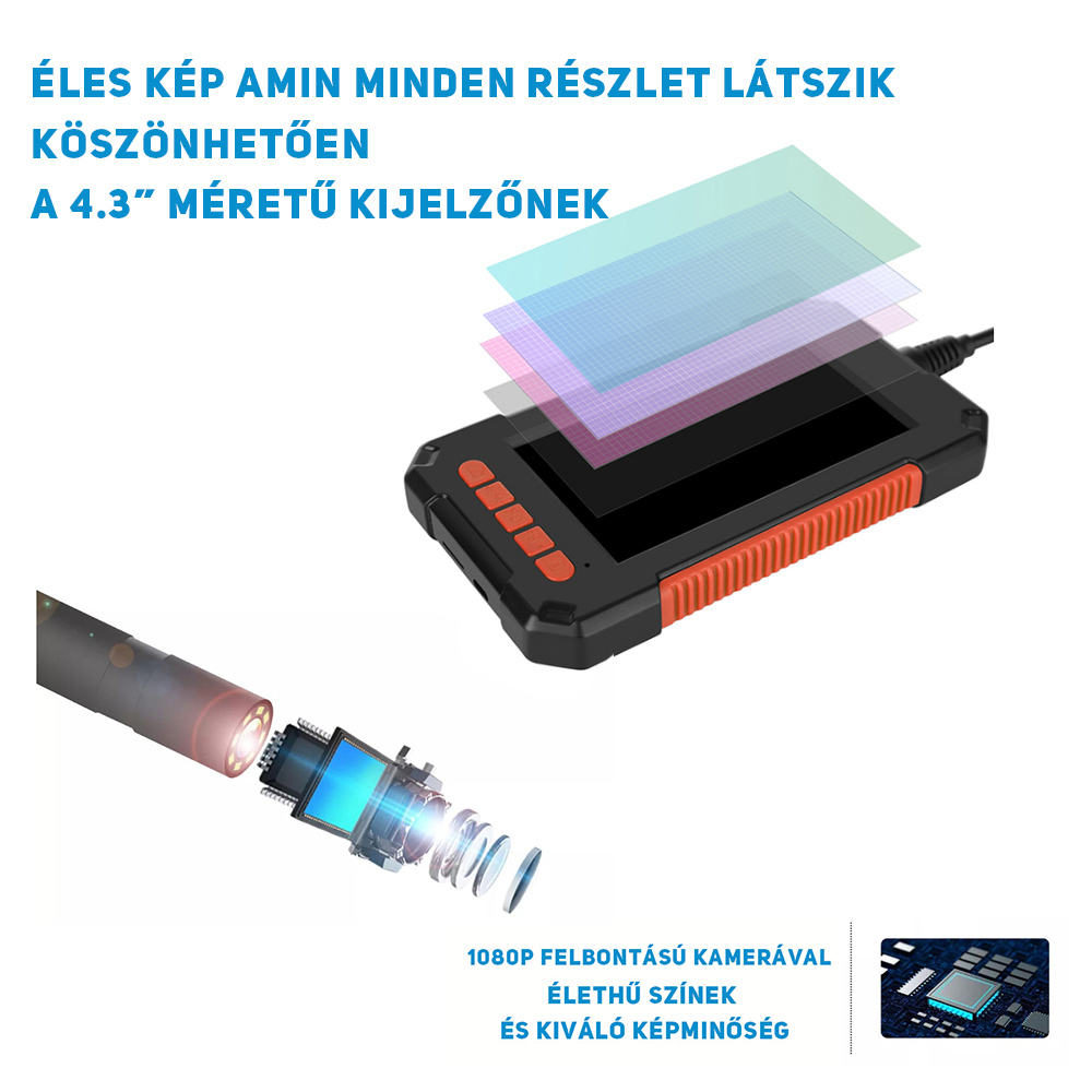 A maximálisan támogatott 1920×1080 pixeles felbontással az endoszkóp kamera tiszta fényképeket készít és kiváló minőségű videókat rögzít. A 4,3″-os színes LCD-képernyő lehetővé teszi az élő videók megtekintését a vizsgálat során.