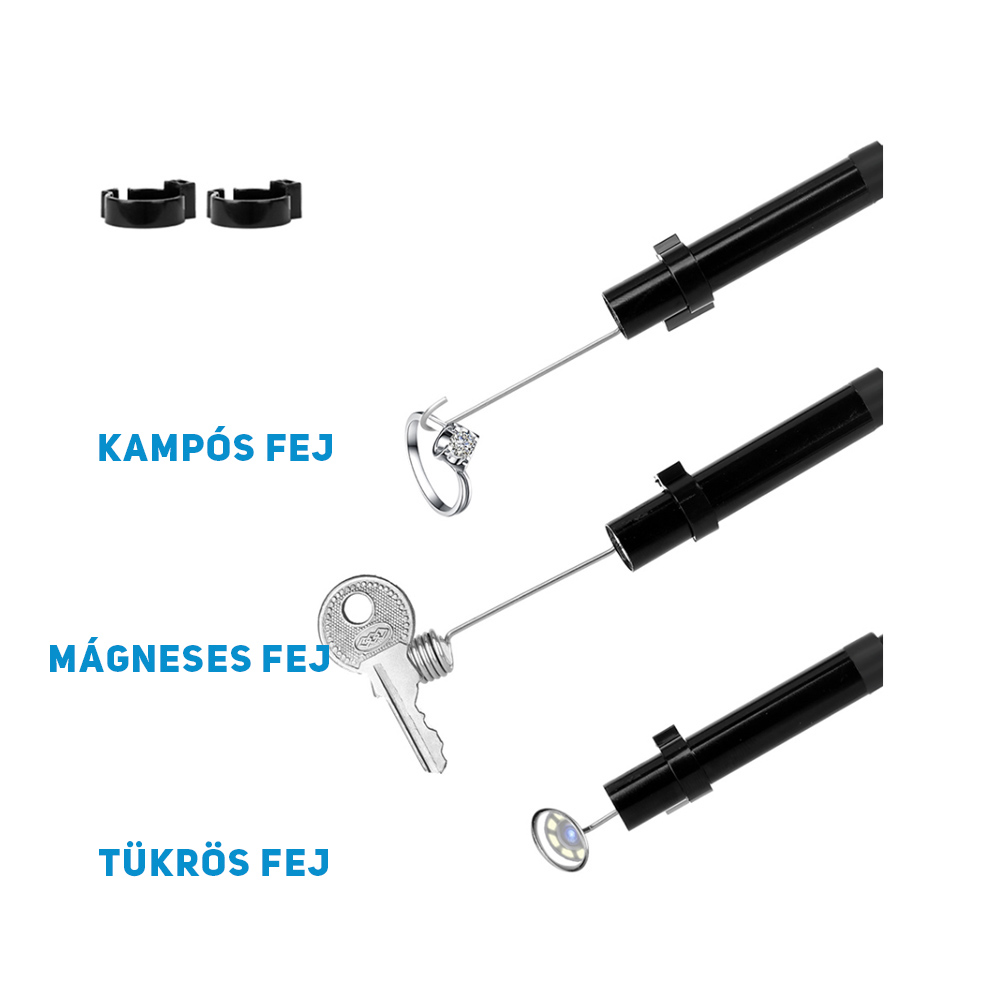 A kamera szetthez tartozik 3 féle kiegészítő fej is, amellyel könnyebben dolgozhatunk. Tükrös fejet, mágneses fejet és kampós fejet is tartalmaz.